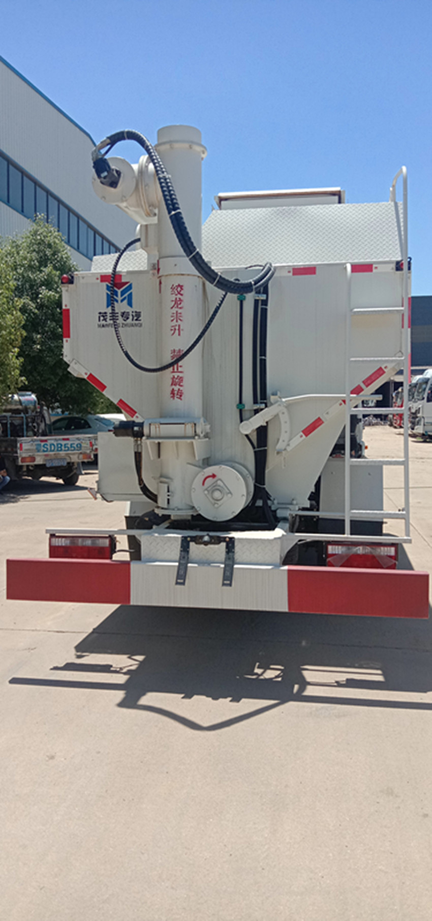 散裝飼料運輸車,散裝飼料車的飼料罐架設在卡車的底盤上,罐頂開有進料口.頂部的一根螺旋輸送卸料管(俗稱卸料絞龍)則可自由回轉和抬升,抬升的仰角可達60度。運輸時,頂部的螺旋管平臥在罐頂;卸料時則抬起,使管端的出料口與畜禽飼養(yǎng)場貯料罐頂部的進料門相接,駕駛室內裝有操縱裝置(操縱裝置也可裝置在罐體尾部),卸料時通過車底的動力輸出軸和減速器來驅動螺旋,以完成卸料。