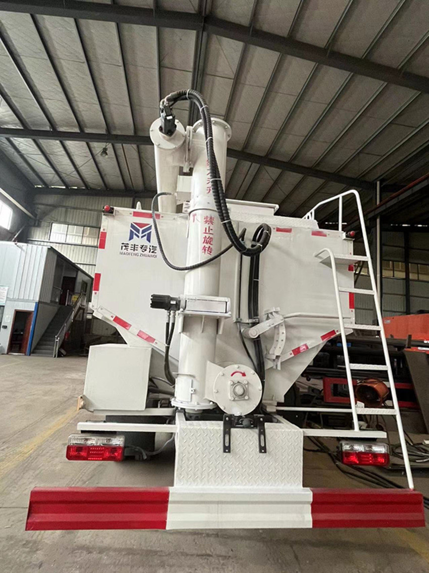 散裝飼料運(yùn)輸車,散裝飼料車的飼料罐架設(shè)在卡車的底盤上,罐頂開(kāi)有進(jìn)料口.頂部的一根螺旋輸送卸料管(俗稱卸料絞龍)則可自由回轉(zhuǎn)和抬升,抬升的仰角可達(dá)60度。運(yùn)輸時(shí),頂部的螺旋管平臥在罐頂;卸料時(shí)則抬起,使管端的出料口與畜禽飼養(yǎng)場(chǎng)貯料罐頂部的進(jìn)料門相接,駕駛室內(nèi)裝有操縱裝置(操縱裝置也可裝置在罐體尾部),卸料時(shí)通過(guò)車底的動(dòng)力輸出軸和減速器來(lái)驅(qū)動(dòng)螺旋,以完成卸料。