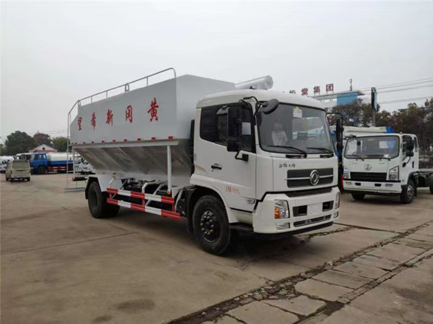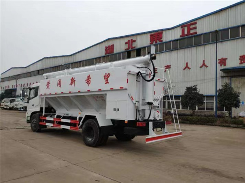 散裝飼料運(yùn)輸車,散裝飼料車的飼料罐架設(shè)在卡車的底盤上,罐頂開有進(jìn)料口.頂部的一根螺旋輸送卸料管(俗稱卸料絞龍)則可自由回轉(zhuǎn)和抬升,抬升的仰角可達(dá)60度。運(yùn)輸時(shí),頂部的螺旋管平臥在罐頂;卸料時(shí)則抬起,使管端的出料口與畜禽飼養(yǎng)場貯料罐頂部的進(jìn)料門相接,駕駛室內(nèi)裝有操縱裝置(操縱裝置也可裝置在罐體尾部),卸料時(shí)通過車底的動力輸出軸和減速器來驅(qū)動螺旋,以完成卸料。