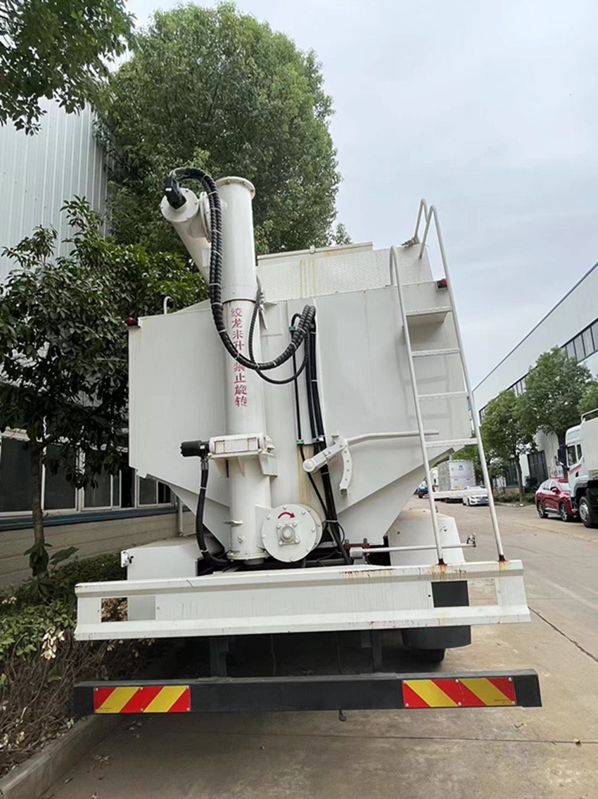 散裝飼料運(yùn)輸車,散裝飼料車的飼料罐架設(shè)在卡車的底盤上,罐頂開有進(jìn)料口.頂部的一根螺旋輸送卸料管(俗稱卸料絞龍)則可自由回轉(zhuǎn)和抬升,抬升的仰角可達(dá)60度。運(yùn)輸時(shí),頂部的螺旋管平臥在罐頂;卸料時(shí)則抬起,使管端的出料口與畜禽飼養(yǎng)場貯料罐頂部的進(jìn)料門相接,駕駛室內(nèi)裝有操縱裝置(操縱裝置也可裝置在罐體尾部),卸料時(shí)通過車底的動力輸出軸和減速器來驅(qū)動螺旋,以完成卸料。